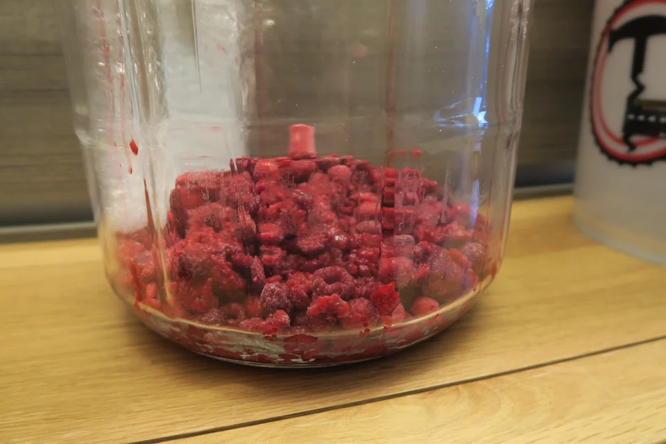 21 Dec 2015: Gravity stable at 1.007. Racked to secondary on 3.2 lbs. of frozen raspberries. Fermentation kicked up again shortly after.